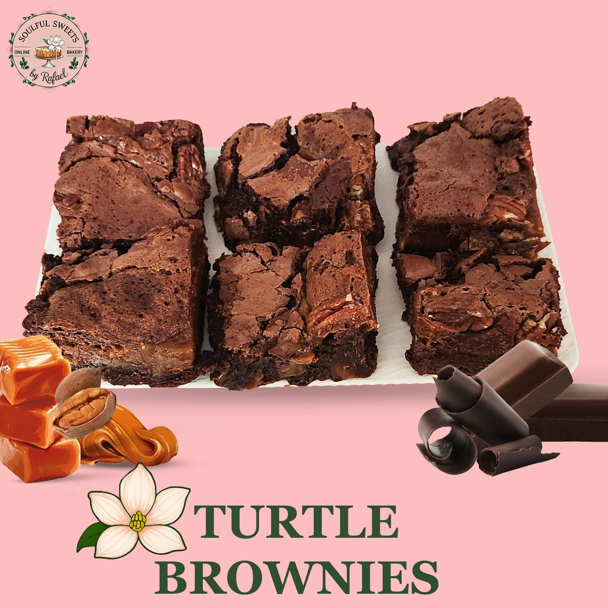 Six Decadent chocolate brownies topped with gooey caramel, crunchy pecans, and a drizzle of chocolate. These indulgent bites are pure comfort food.