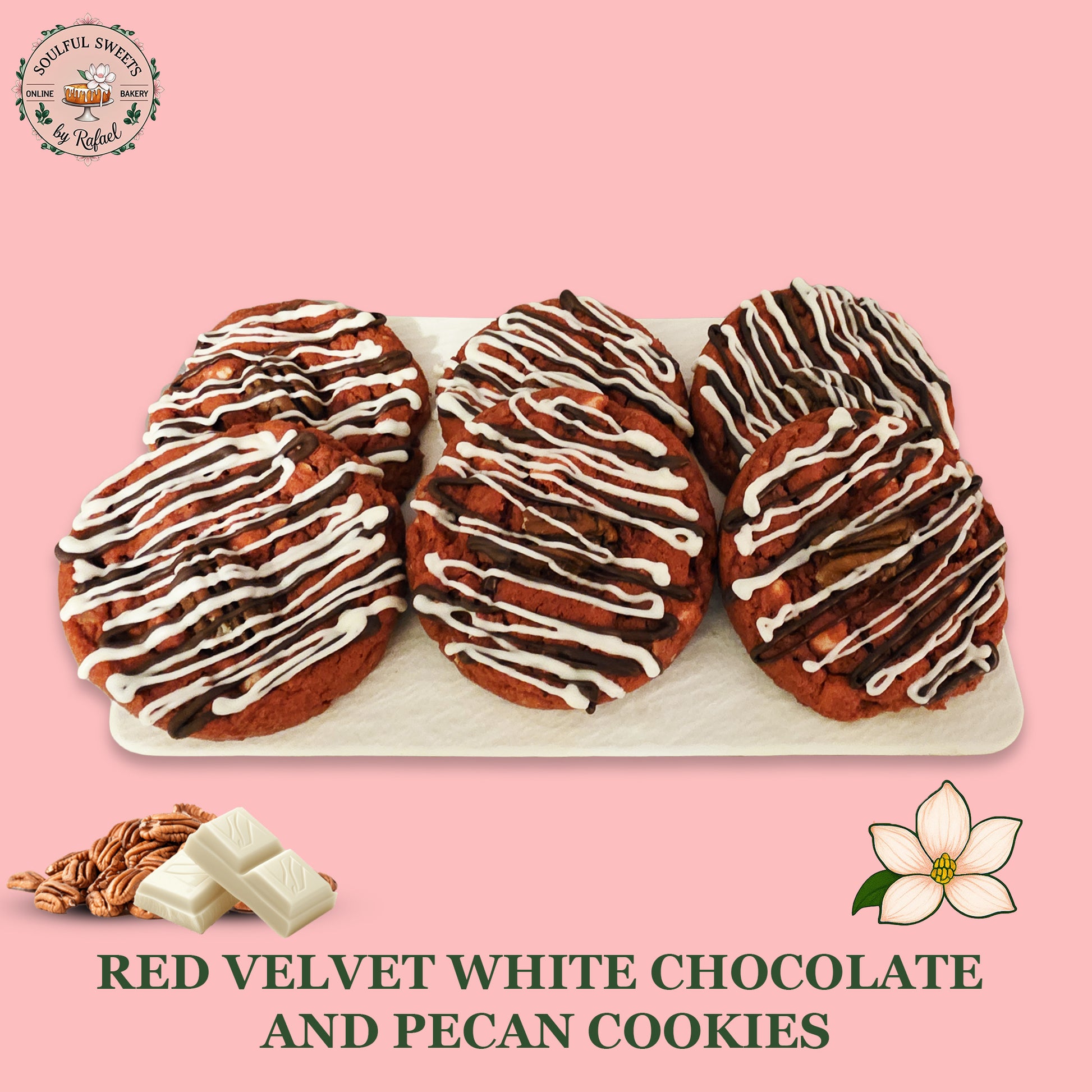 Our Red Velvet White Chocolate Chip Pecan Cookies are a decadent twist on a classic favorite. Each cookie starts with a deep red velvet base, perfectly balanced with hints of cocoa and vanilla. We fold in creamy white chocolate chips and buttery toasted pecans, then finish with white and semi-sweet chocolate drizzles for a balanced bite. (6 jumbo cookies per order)